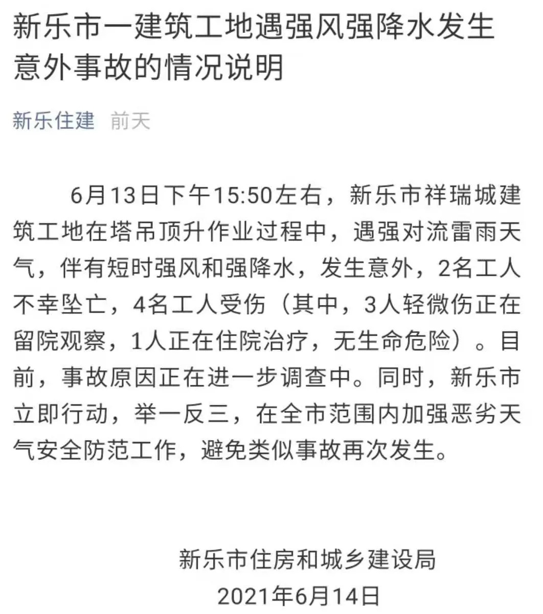 新樂住建消息,2021年6月13日下午15:50左右,石家莊新樂市祥瑞城建筑工地在塔吊頂升作業過程中,遇強對流雷雨天氣,2名工人不幸墜亡,4名工人受傷。目前,事故原因正在進一步調查中。