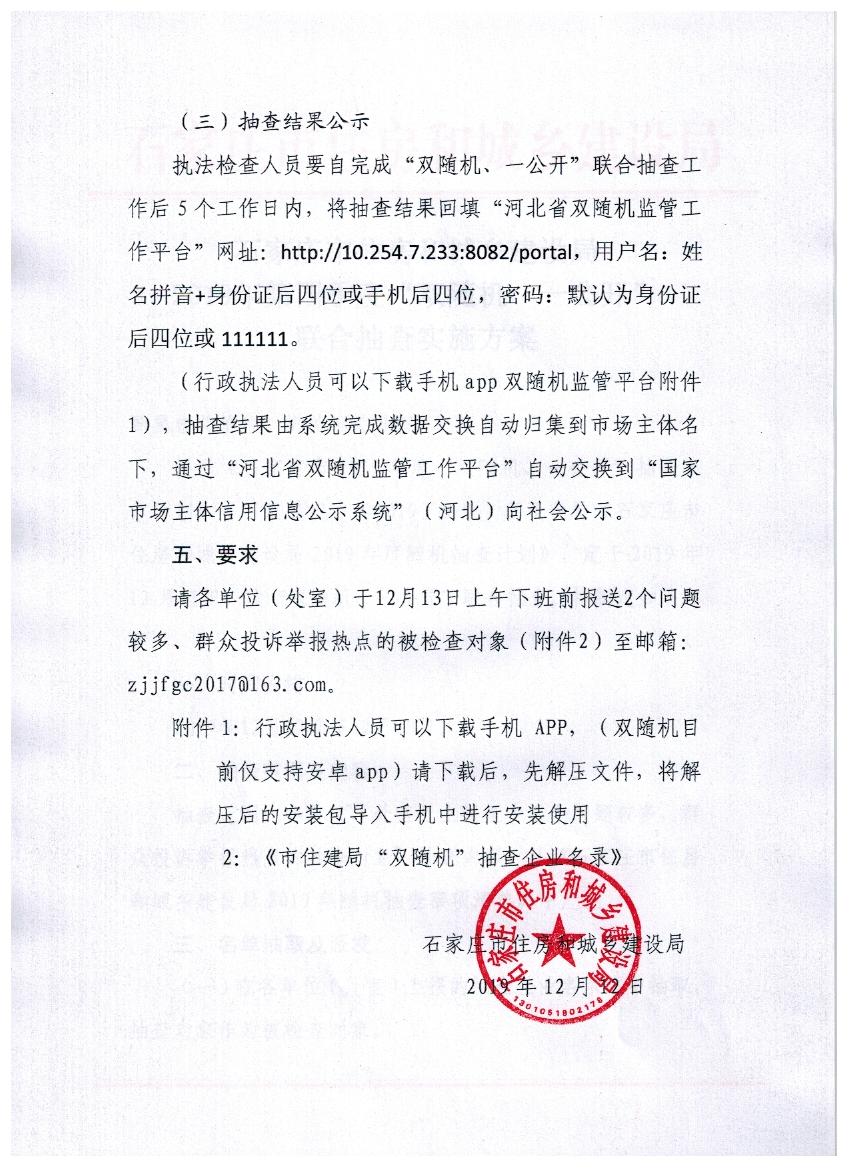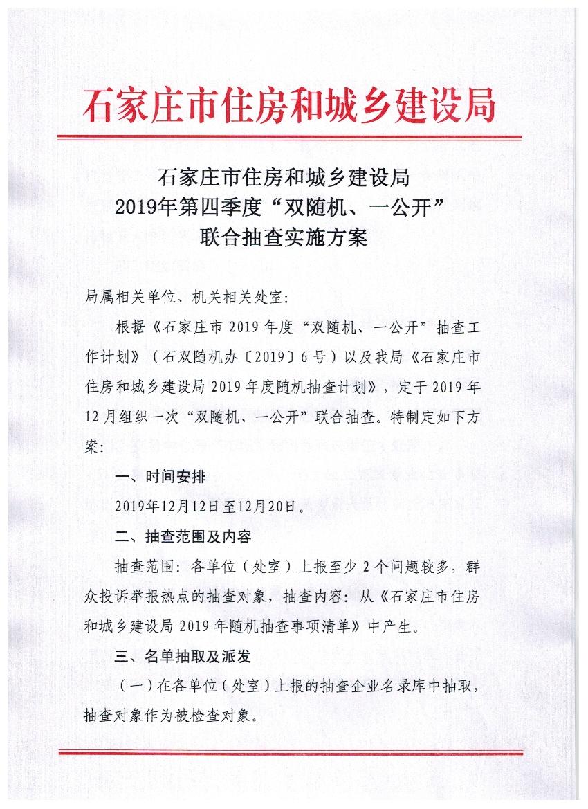 局屬相關(guān)單位、機(jī)關(guān)相關(guān)處室:根據(jù)《石家莊市2019年度“雙隨機(jī)、一公開”抽查工作計(jì)劃》(石雙隨機(jī)辦〔2019]6號)以及我局《石家莊市住房和城鄉(xiāng)建設(shè)局2019年度隨機(jī)抽查計(jì)劃》,定于2019年12月組織一次“雙隨機(jī)、一公開”聯(lián)合抽查。特制定如下方案。